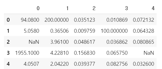 실제 데이터는 900 rows x 500 columns 정도의 크기지만, 여기서 우리는 데이터 분석을 실제로 하는 게 아니라 누락 데이터 처리 연습을 할 것이기 때문에 누락 데이터가 있는 부분만 알기 쉬운 형태로 바꾸도록 하겠다.