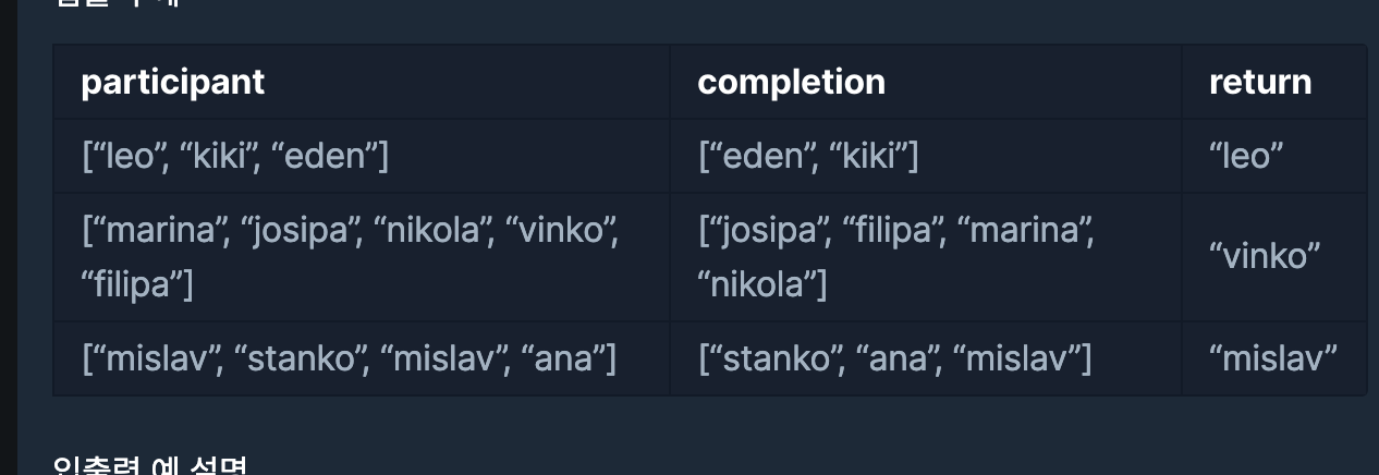 수많은 마라톤 선수들이 마라톤에 참여하였습니다. 단 한 명의 선수를 제외하고는 모든 선수가 마라톤을 완주하였습니다. 마라톤에 참여한 선수들의 이름이 담긴 배열 participant와 완주한 선수들의 이름이 담긴 배열 completion이 주어질 때, 완주하지 못한 선수의 이름을 return 하도록 solution 함수를 작성해주세요. 제한사항 마라톤 경기에 참여한 선수의 수는 1명 이상 100,000명 이하입니다. completion의 길이는 partic