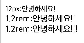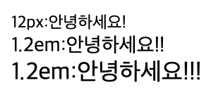 다음과 같이 부모 요소를 12px로 정의했을 때 자식 요소를 1.2em 으로 정의하면 자식 요소는 12px*1.2=14.4px로 정의됩니다.