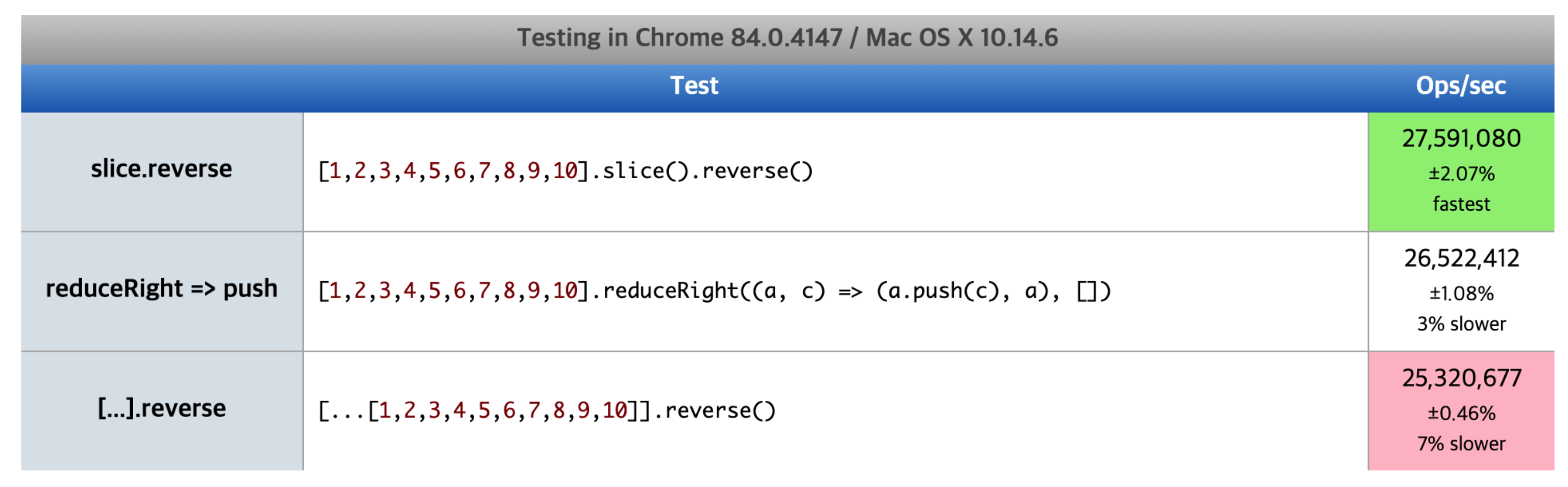이 세가지의 속도를 비교한 것은 다음과 같습니다. 다음 테스트 케이스는 이 링크를 통해 테스트 가능합니다. ….reverse vs .slice.reverse · jsPerf