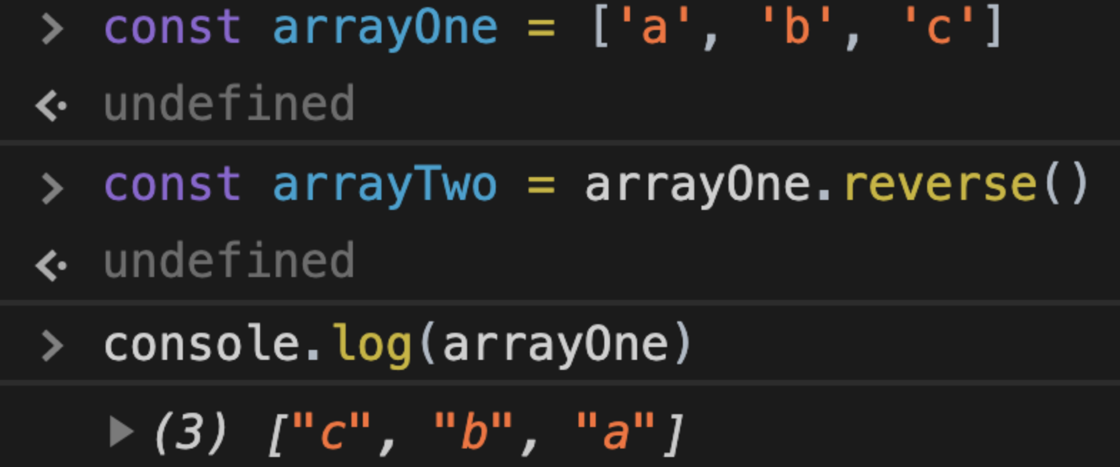 console.log(arrayTwo); // [ 'c', 'b', 'a' ]